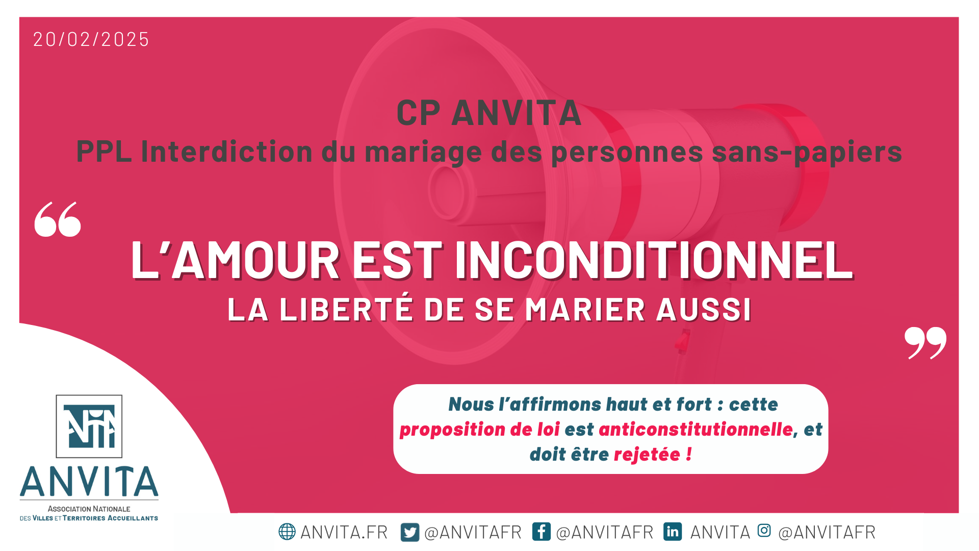 Ce jeudi 20 février 2025, le Sénat étudie l’interdiction du mariage lorsque l’une des deux personnes n’a pas de titre de séjour. Le mariage est un droit fondamental pour toute personne vivant sur le sol français, quel que soit son statut administratif. Nous, maires de l’Association Nationale des Villes et Territoires Accueillants (ANVITA), habilité·es à célébrer les mariages, refusons cette mesure xénophobe et contraire à notre État de droit.